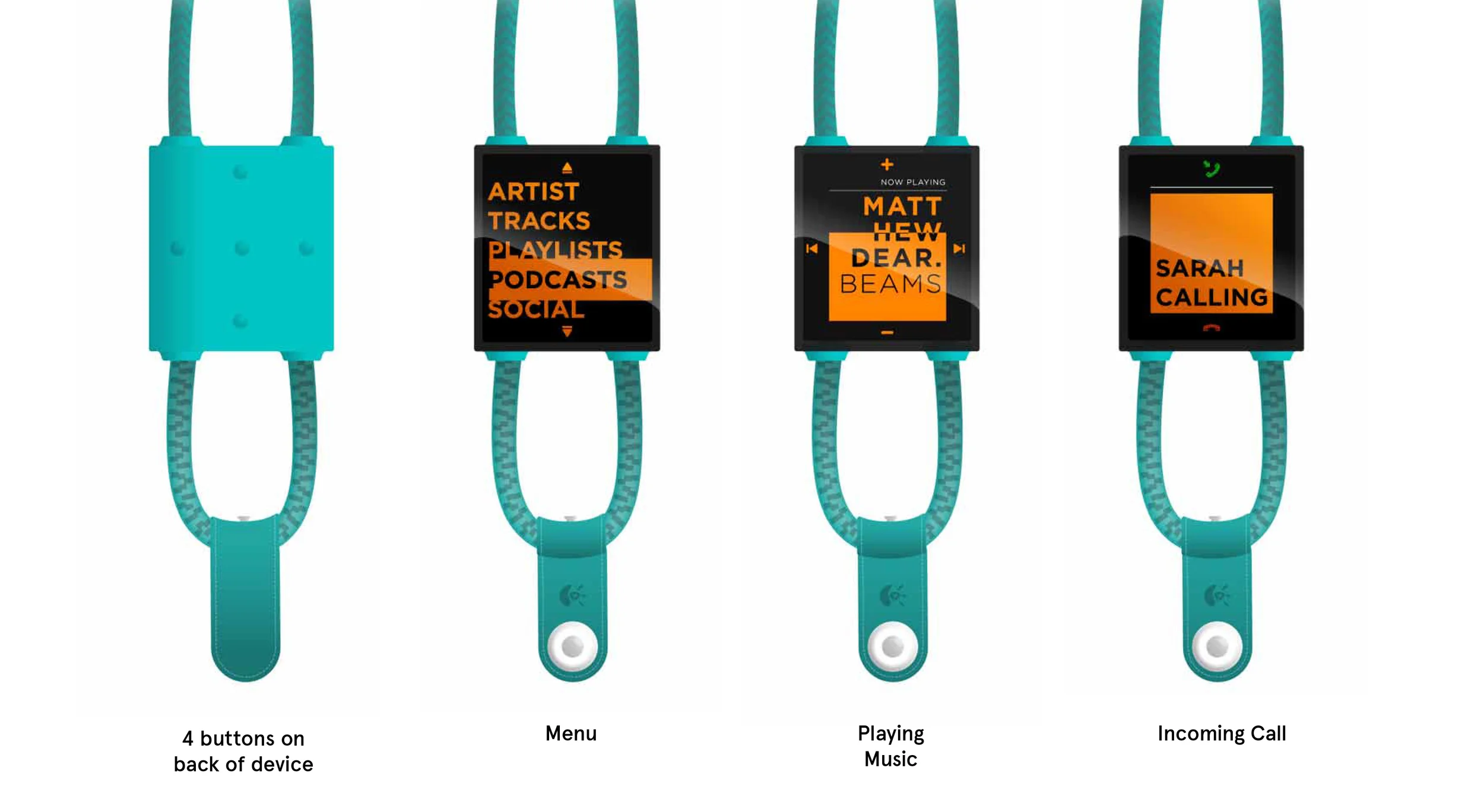 I worked on the creation of multiple wearable media controlling devices for Logitech. The concept, was a device that would connecto to a smartphone via bluetooth and relay information to the user and allow them to control music that they were currently listening to.